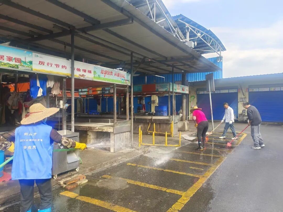 市市场监督管理局组织全市17个农贸市场开展市场内及周边环境卫生整治,市场管理方、商户、志愿者共同清理摊位杂物、疏通排水管道,并在每日收市后进行全面大扫除,为市民置办年货营造安心、整洁的环境。